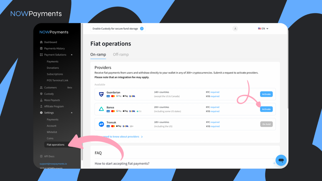 - Streamlined Experience: Banxa and NOWPayments handle the heavy lifting of fiat-to-crypto conversion, while you focus on growing your business.