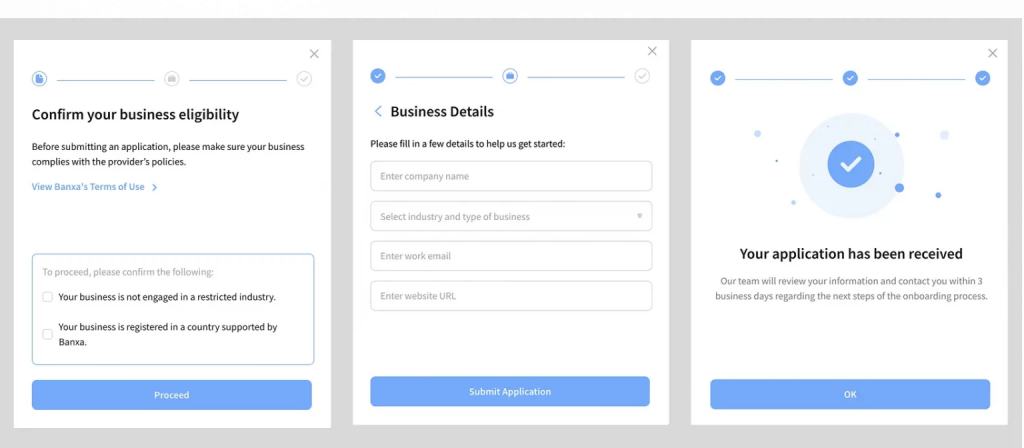 After applying, the NOWPayments team will review your submission and contact you within 3 business days to guide you through the Know Your Business (KYB) process, a necessary step for onboarding with Banxa.