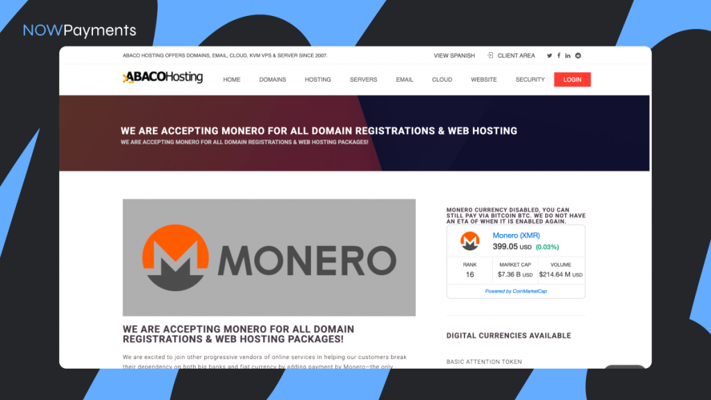 Benefit for crypto users. Using Abaco Hosting lets you pay for hosting and domains without involving traditional banks or credit card systems. That means more privacy and less dependency on financial intermediaries, which appeals to crypto‑savvy users who value anonymity and freedom of financial choice. Here you can choose from more than 500 available domain extensions and buy a domain with Monero, Bitcoin, Litecoin, Ethereum, Dash, Digibyte, and Bitcoin Cash.