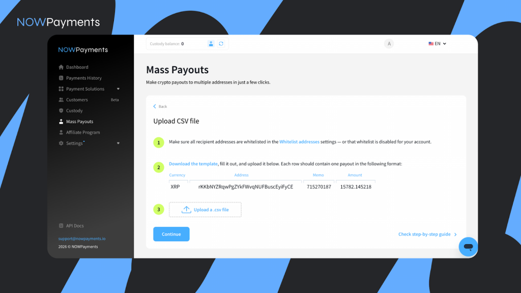 Setting up crypto mass payouts is straightforward and efficient. With NOWPayments, businesses can either upload a CSV file with recipient details or integrate an API to automate the entire process.