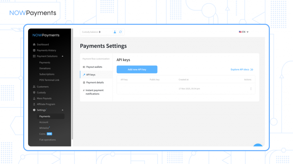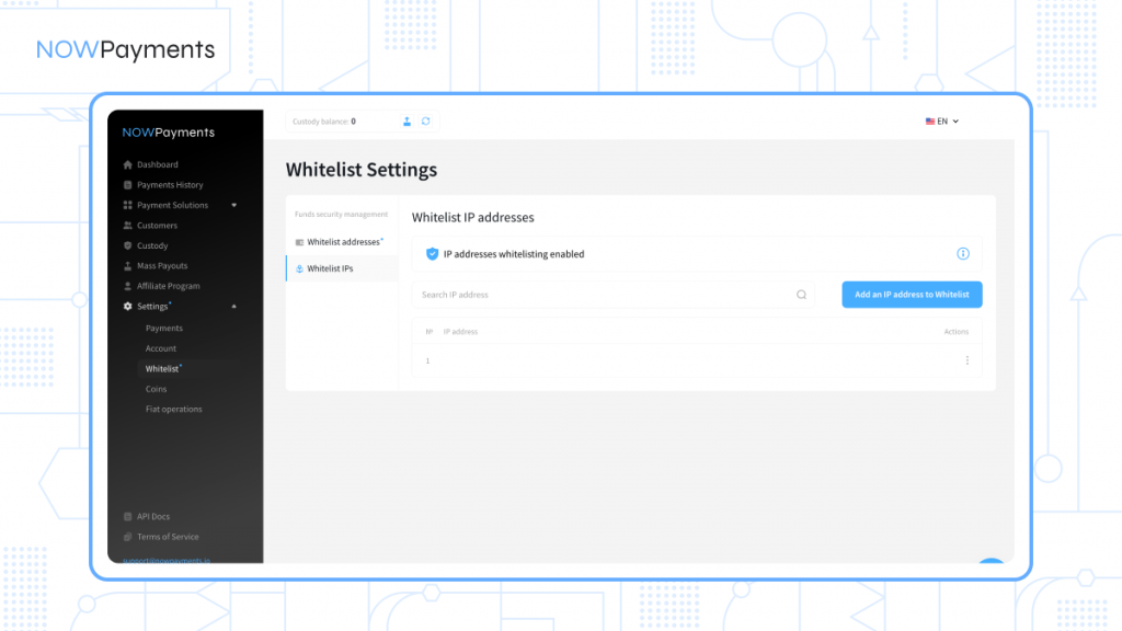 To start using NOWPayments Custody, just create an account, enable the Custody feature in your Dashboard settings, and whitelist your trusted addresses and IP addresses for security. As soon as you are done with these steps, you are ready to start receiving and managing crypto payments.