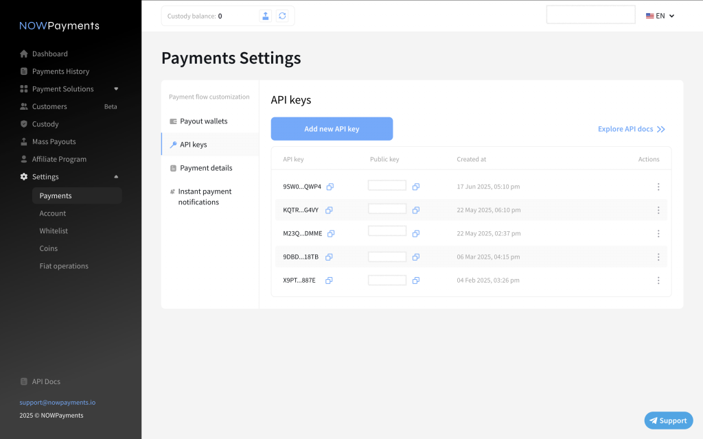 - Generate your own unique API key through the website by going to the API Keys section. Make sure to select what kind of payments you will be sending or receiving here.