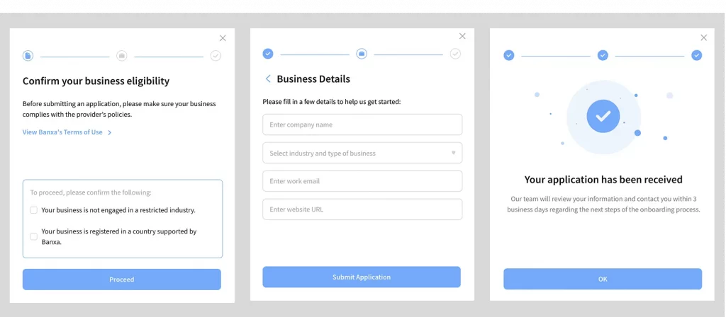 Our team will review your submission and contact you within 3 business days to guide you through the required KYB (Know Your Business) process.