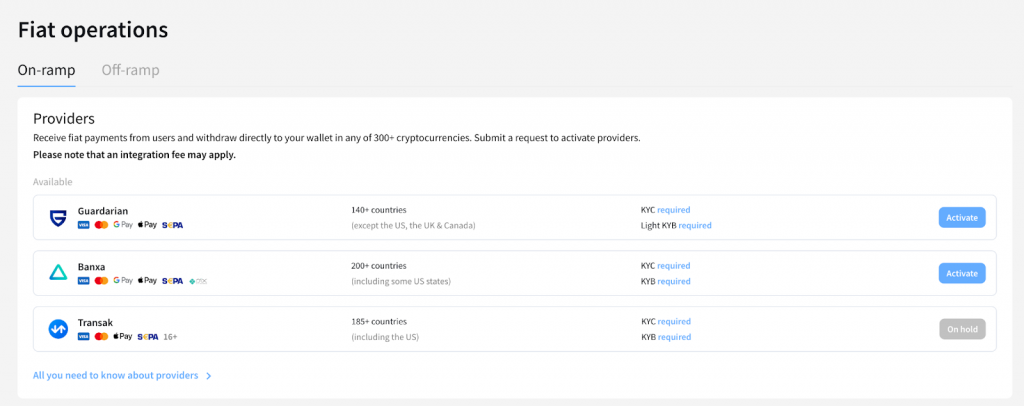 You can accept credit card payments by enabling one of the fiat on-ramp providers. Please note that the provider requires a KYB (Know Your Business) process.