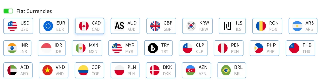 - Select your desired fiat currencies (e.g., USD, EUR, GBP, AUD, CAD).