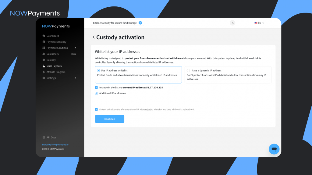 - Whitelist IP Addresses: Add your business IP addresses to the whitelist for added security.