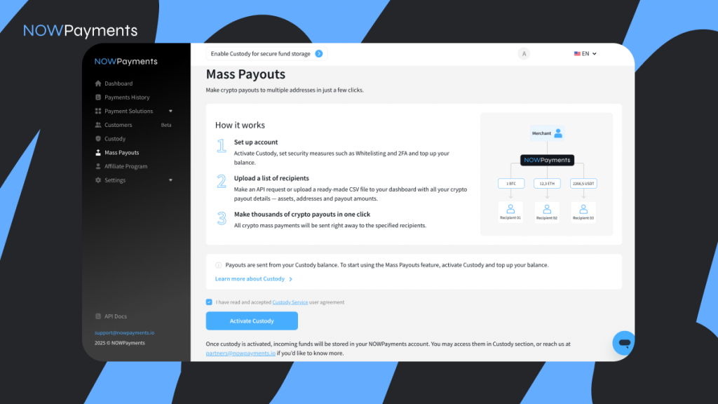 NOWPayments’ Mass Payouts turns this process into a streamlined, automated operation:
