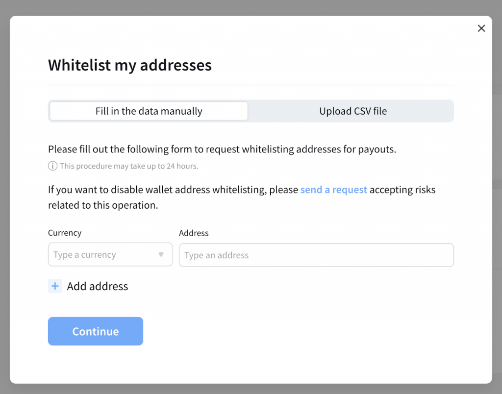 You can request to add wallet addresses to your whitelist under Mass Payouts > Whitelist addresses