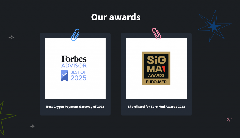 The “Best Crypto Payment Gateway of 2025” label is now on the homepage, in the “Our Awards” section, right below the Forbes logo. This shows how well-known and trusted NOWPayments is in the world of cryptocurrency, which is constantly changing.