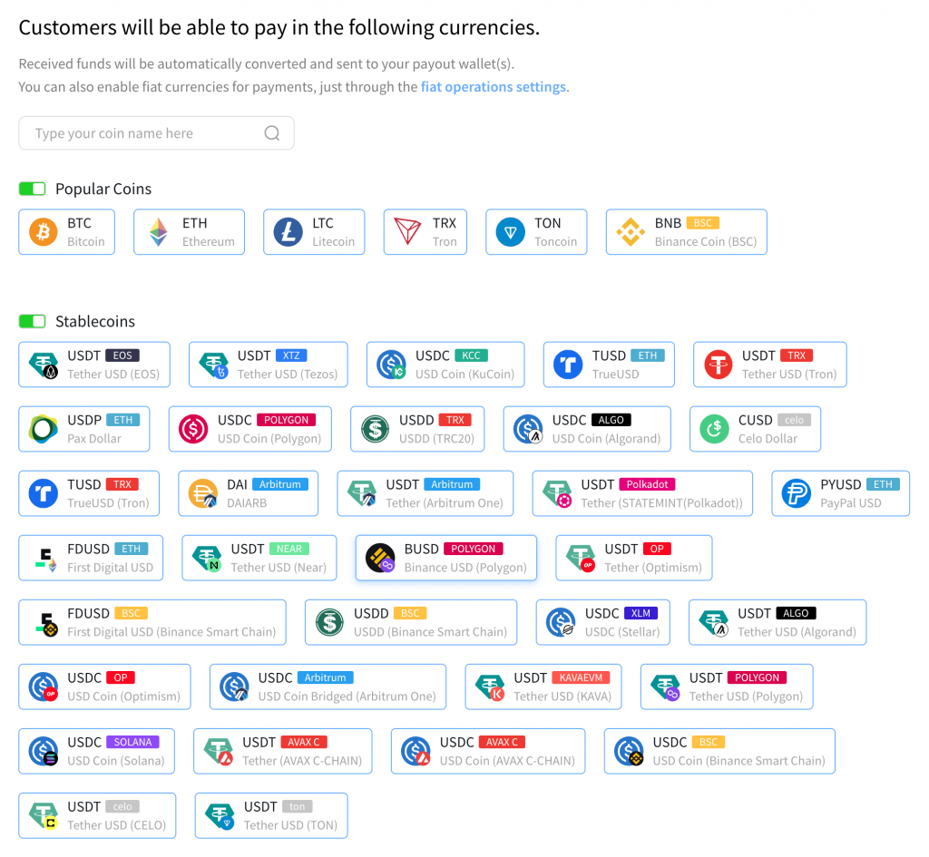 - Added new invoice buttons: All (by default), Popular, Stablecoins, Fiat, Bridged.