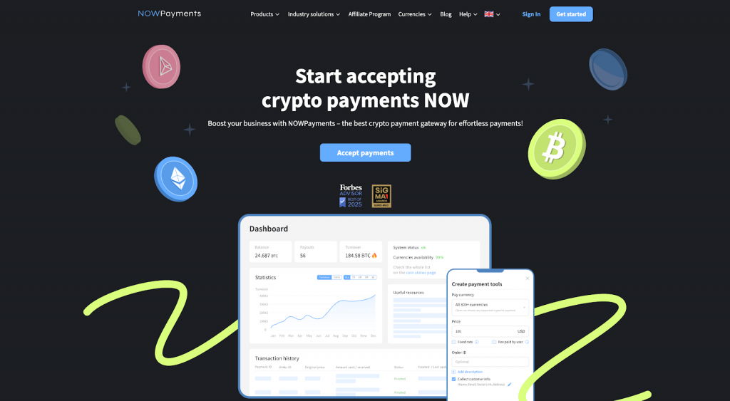 NOWPayments is the best crypto payment gateway on our list because it can easily handle both regular payments and payments made with cryptocurrency. Real estate companies that do business with clients from other countries and make big deals will find this flexibility very useful. Also, NOWPayments makes it easy to split commissions, which is great for brokers and agencies that are working with more than one person on a single deal.